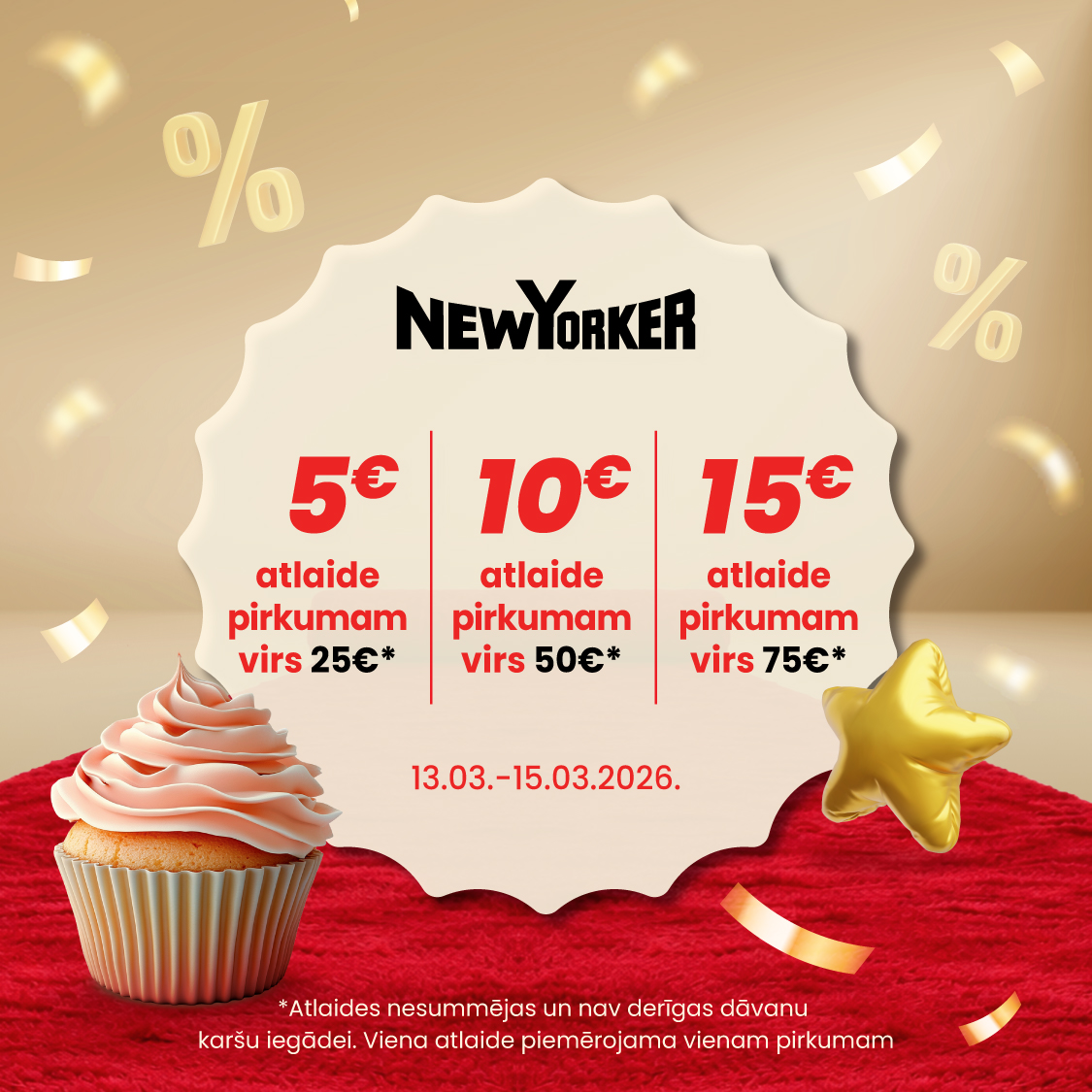 | NEW YORKER | 5 € atlaide pirkumam virs 25 € 10 € atlaide pirkumam virs 50 € 15 € atlaide pirkumam virs 75 € Atlaides nesummējas un nav derīgas dāvanu karšu iegādei. Viena atlaide piemērojama vienam pirkumam. 13.03.-15.03.2026. |