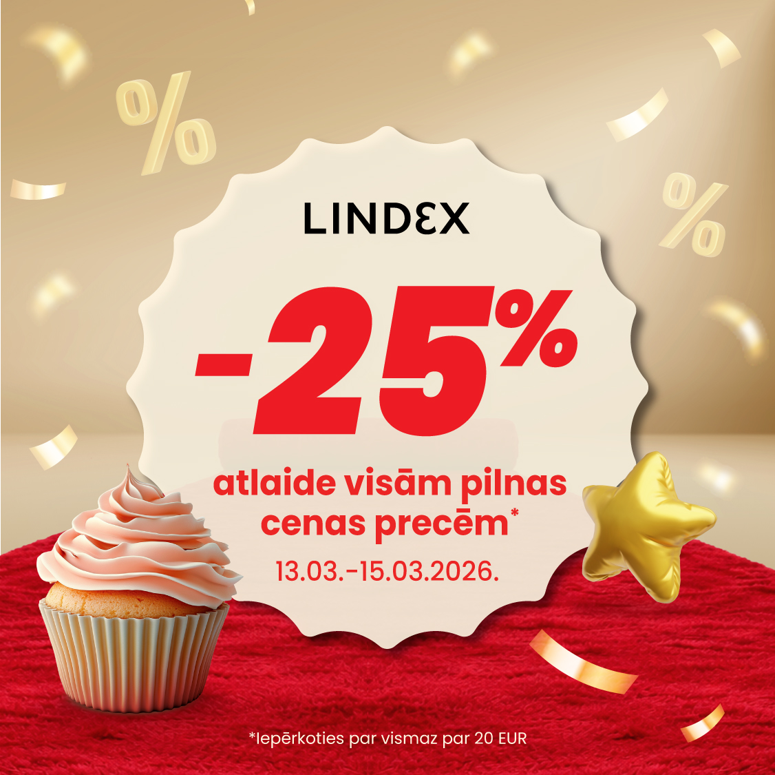 | LINDEX | -25% atlaide visām pilnas cenas precēm, iepērkoties vismaz par 20 €. Piedāvājums spēkā lojalitātes programmas “More at Lindex” dalībniekiem. 13.03.–15.03.2026. |
