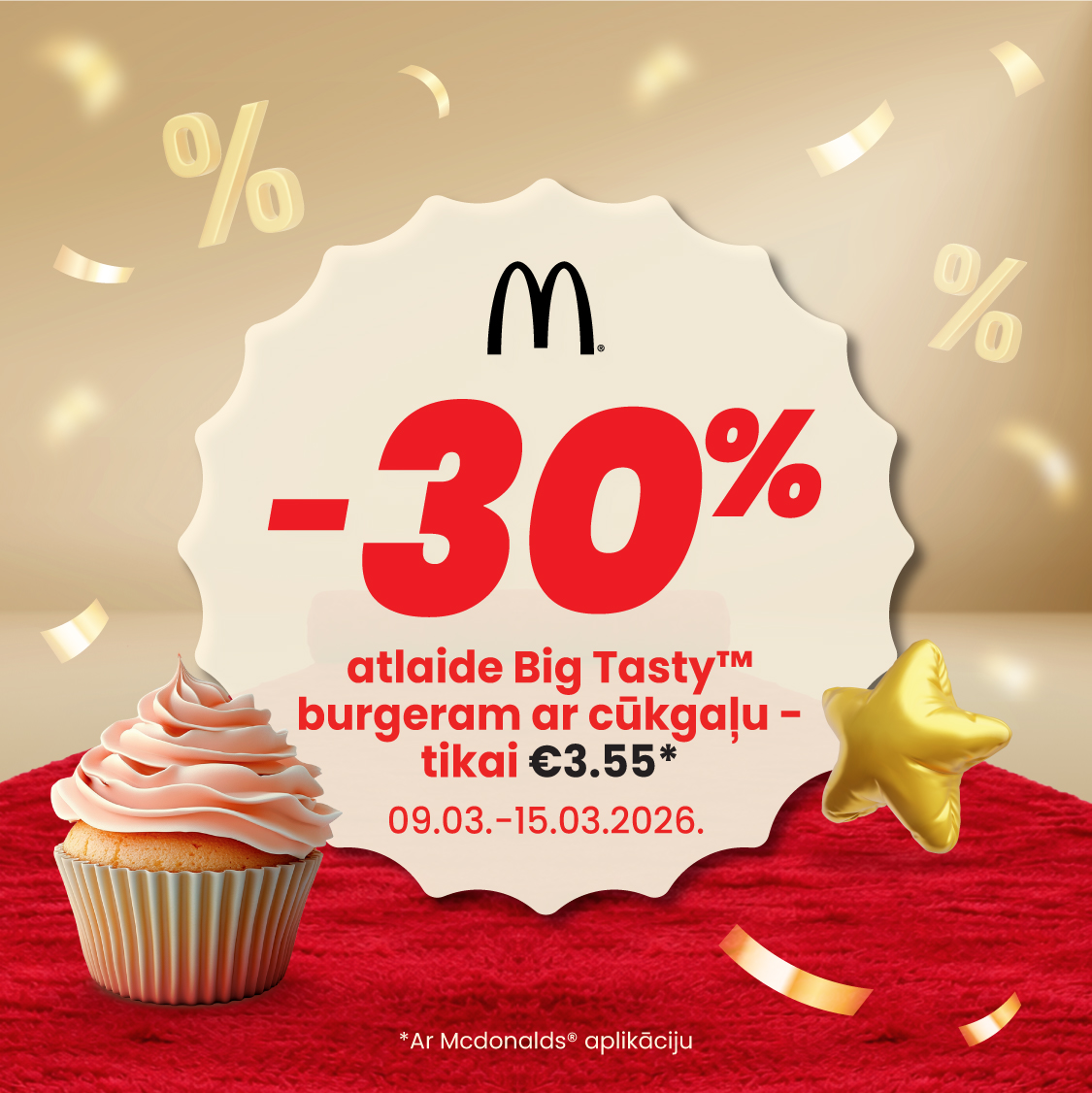 | McDonald’s | Big Tasty™ burgers ar cūkgaļu tikai 3,55 € (-30% no sākuma cenas 5,10 €), izmantojot McDonald’s® aplikāciju. 09.03.-15.03.2026. |