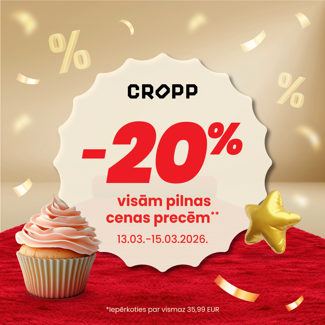 | CROPP | -20% atlaide pilnas cenas precēm, iepērkoties par vismaz 35,99 €. 13.03.-15.03.2026. |