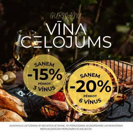Gurmanu vīna ceļojums! Pirkt vairāk ir izdevīgāk. Pērkot 3 vīnus, saņem -15%, savukārt pērkot 6, saņem -20%.